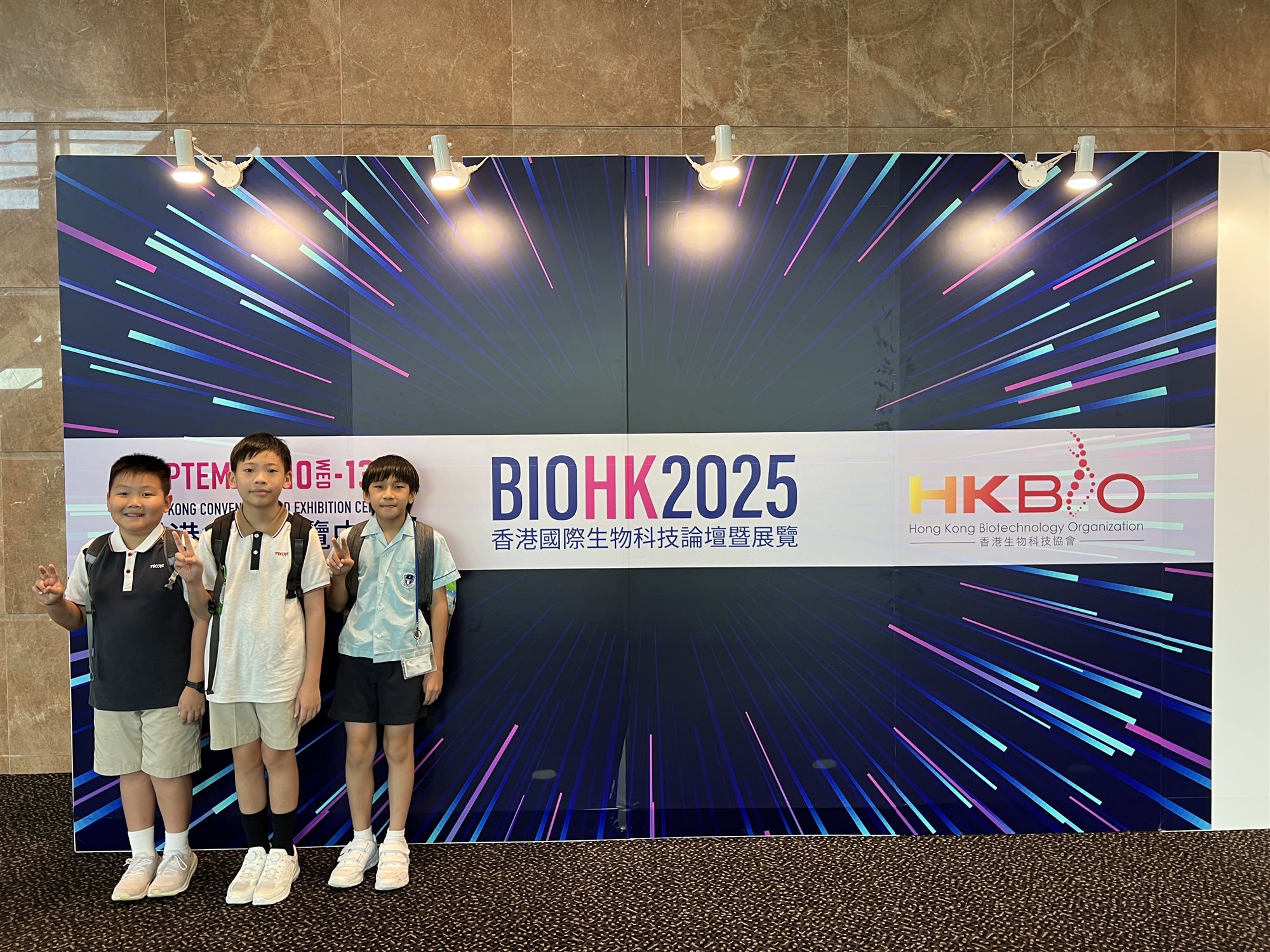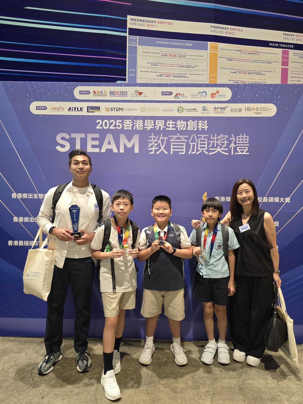 本校蔡嘉衡老師、5A 袁樂正、6A 楊建一及6D 鄭懿朗在「2025香港學界生物創科及steam教育精英大賽」分別獲得「香港傑出STEAM 教師大獎」及「香港傑出STEAM學生大獎」,可喜可賀。典禮完結後,學生在展覽中認識最新生物科技發展。