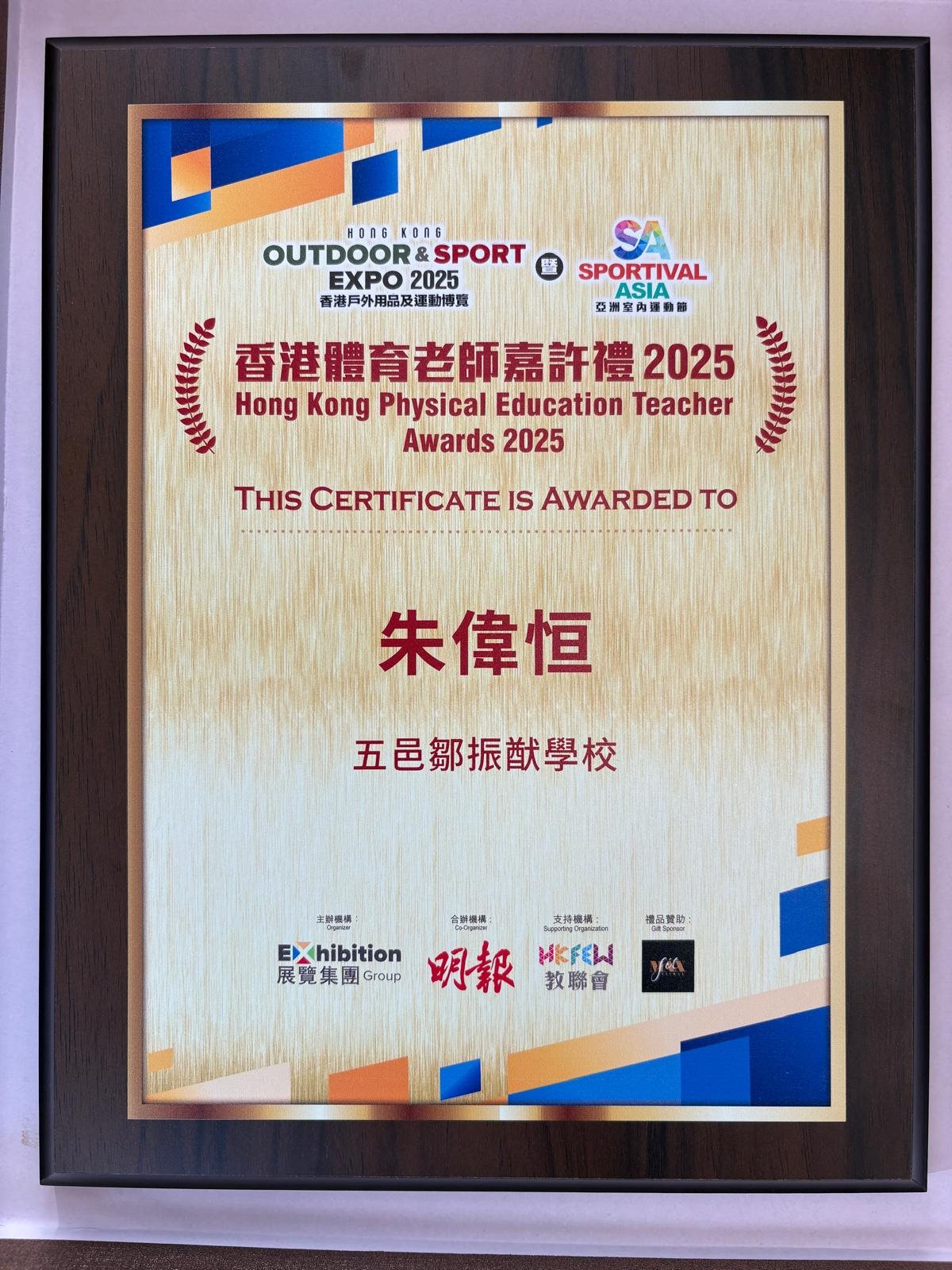 恭喜朱偉恒主任於「香港體育老師嘉許禮 2025」中獲獎