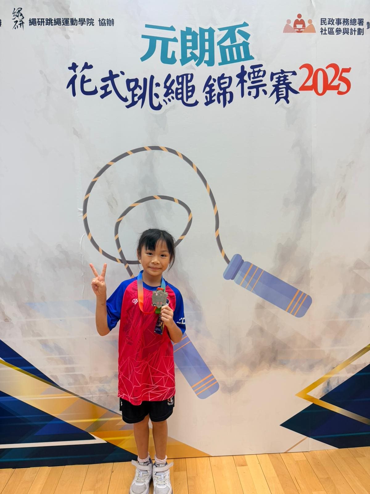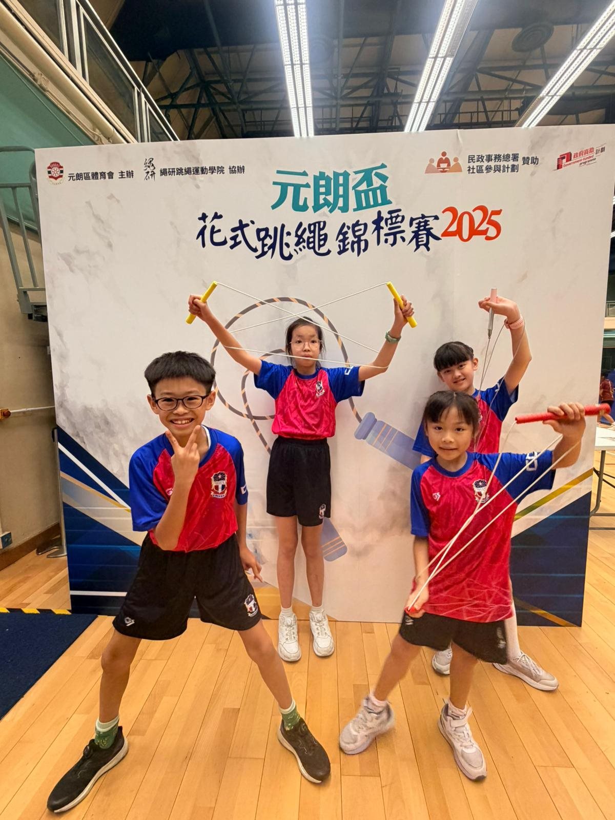 於元朗盃花式跳繩比賽2025中,2C班張旻禧同學獲得女子丙組30秒單車步亞軍,3C班郭頌呈同學獲得女子乙組90秒單車步亞軍。